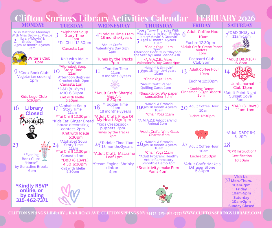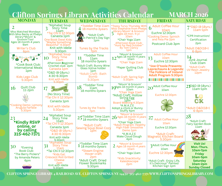 The Clifton Springs Library no longer charges late fees for print materials and audio books. Click here for more information.