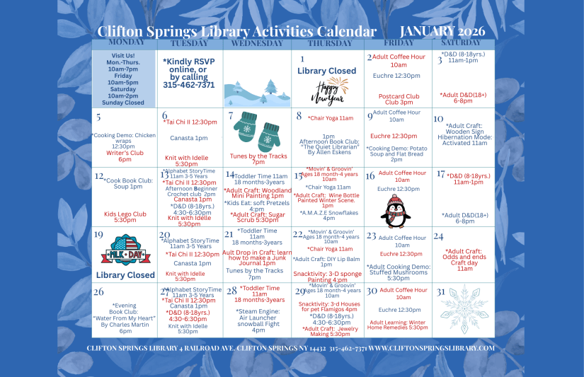 For more information or to register call the library at 315-462-7371 or email Becky.